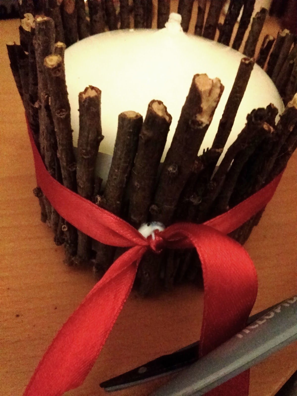 - Per prima cosa si scelgono i rami da utilizzare: conviene prendere quelli non molto doppi, senza grosse sporgenze o curvature. In base all'altezza della candela si stabilisce quanto dovranno essere alti i pezzi di ramo (vedi foto), quindi dal foglio di carta si ricava una striscia lungo quanto il diametro della candela più 2 cm ed alta quanto la candela meno 2 cm.